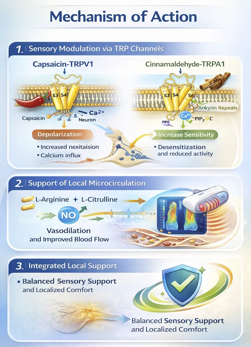 Through complementary mechanisms involving sensory neuron modulation and support of local microcirculation, the formulation provides localized support for skin comfort and sensory balance.